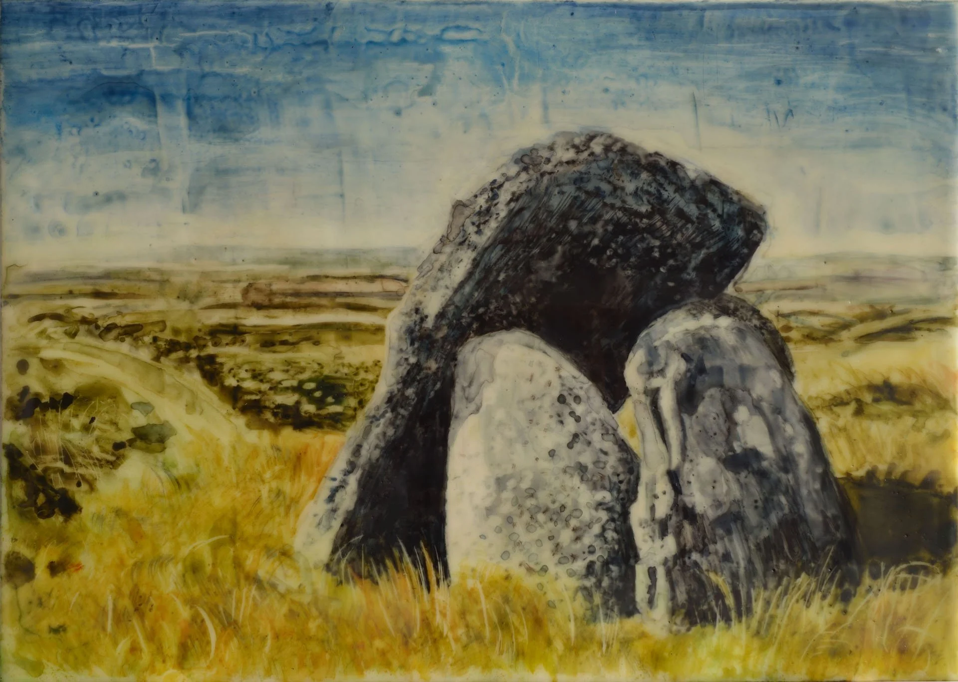 The encaustic watercolor paintings, which are an exploration into family heritage and place, reference my father’s astro-archeaological research photos. Using his images has been a profound way to connect with him. In 2013 I traveled to England to visit many of those same monuments and take my own photos. The images and experiences from that trip informed additional paintings.